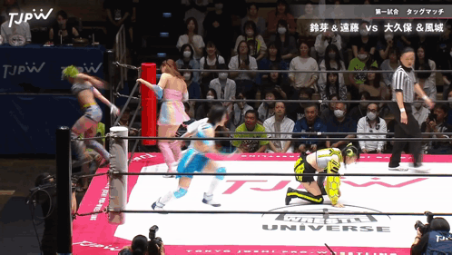 a woman in a yellow and black outfit is kneeling down in a wrestling ring that says wrestle universe