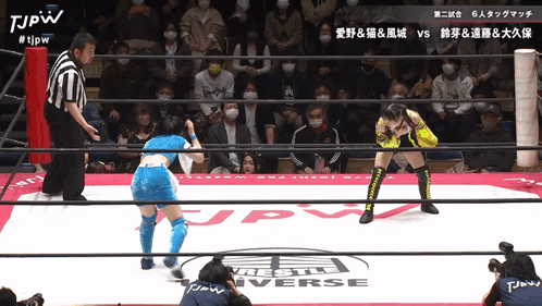 two women in a wrestling ring with jpw written on the bottom right