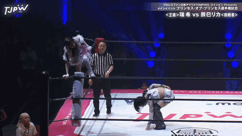 a woman in a wrestling ring with tjpw written on the bottom of the screen