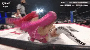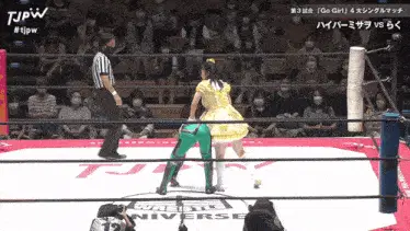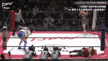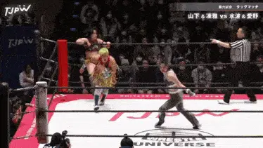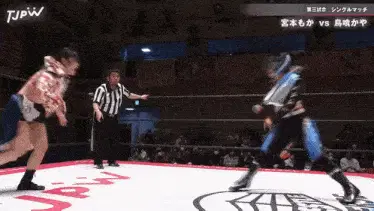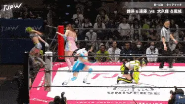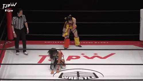 two women are wrestling in a ring that says tjpw on the side