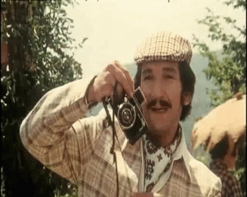 Gospon Fulir from "Tko Pjeva Zlo Ne Misli" holds a camera, asking "Milostivica" for another shot.