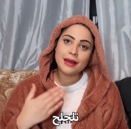 Sahar, from The Ys Family, speaks to the camera while wearing a cozy hooded jacket, with the Arabic caption 'تلحلح' (Come on) on screen.