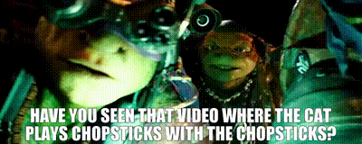 Michelangelo from Teenage Mutant Ninja Turtles (2014) with a caption referencing the 'cat plays chopsticks' meme.