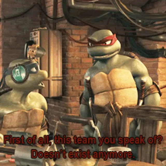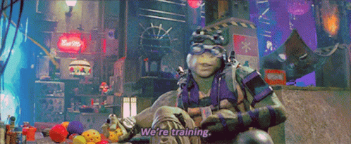 Donatello from Teenage Mutant Ninja Turtles declares "We're training" while surrounded by colorful objects.