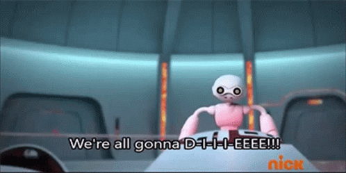Fugitoid from TMNT 2012 exclaims, 'We're all gonna D-I-I-I-EEEE!!!' in a moment of panic.