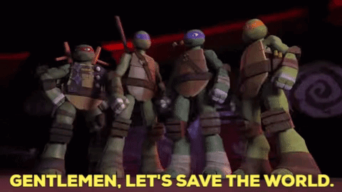 Leonardo and the Teenage Mutant Ninja Turtles stand ready, declaring 'Gentlemen, let's save the world' in this animated scene.