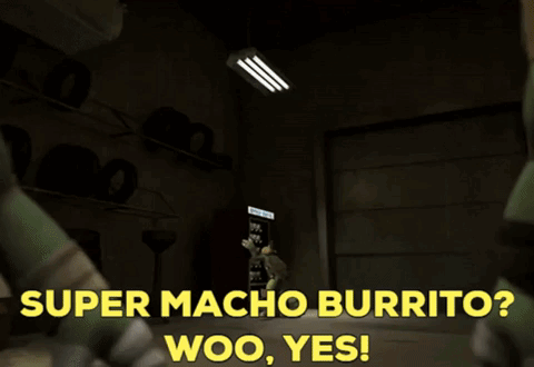 Michelangelo from TMNT excitedly approaches a vending machine for a Super Macho Burrito.