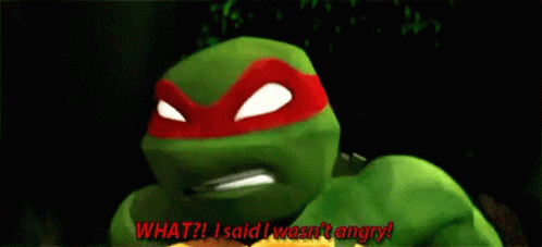 Raphael from TMNT angrily denies being angry, exclaiming 'WHAT?! I said I wasn't angry!'