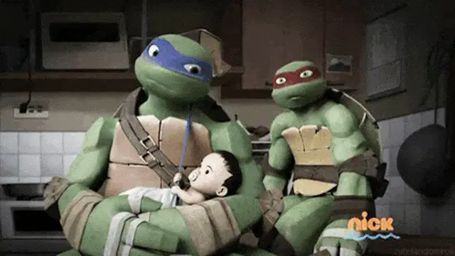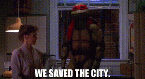 Raphael from Teenage Mutant Ninja Turtles proudly declares, 'We saved the city!' in a kitchen scene.