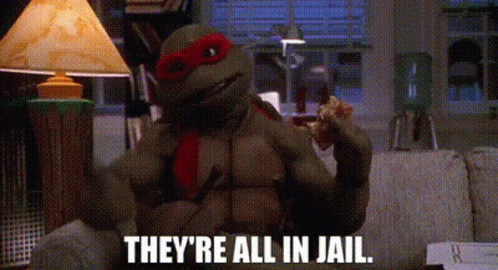 Raphael from TMNT sits on a couch, delivering the iconic line "They're all in jail."