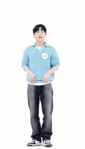 TNX member Sungjun performs an energetic dance in a blue sweater and black jeans.