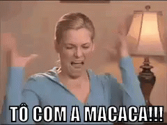 A woman screaming in frustration with her hands raised, expressing the Portuguese idiom 'Tô Com A Macaca' (I'm in a bad mood).