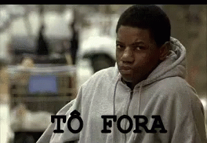 A man in a grey hoodie pulls up his hood, with the Portuguese phrase 'Tô Fora' displayed on screen.