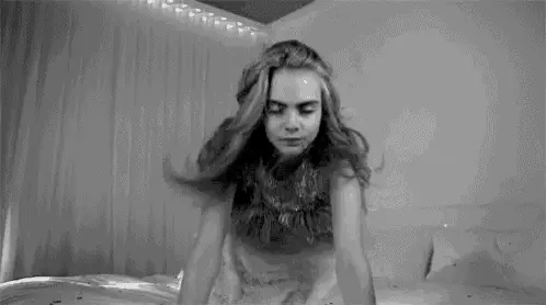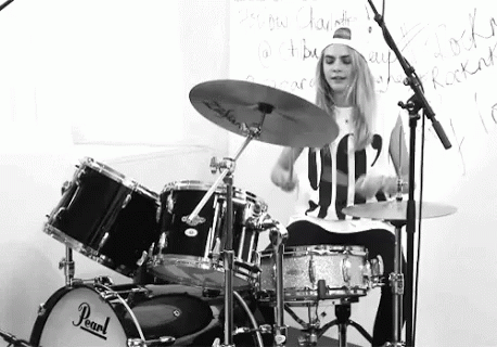 Cara Delevingne energetically playing drums in a black and white video, showcasing her rocker side.