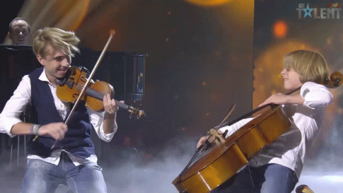 Two young boys energetically playing violin and cello on the Got Talent España stage.
