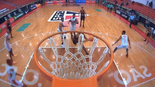 A spectacular basketball block (toco) during a Novo Basquete Brasil game in São Paulo, captured from a unique overhead perspective of the hoop.