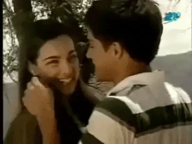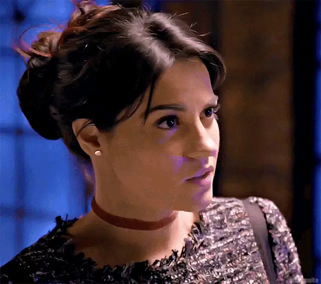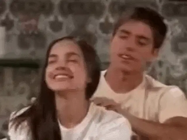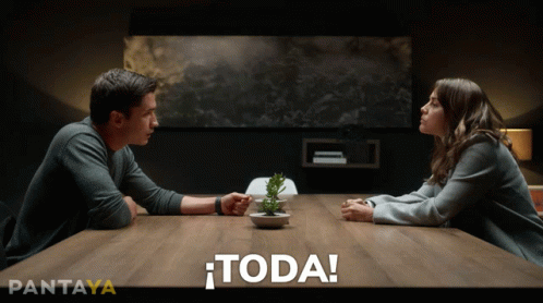 María Elisa Camargo as Mariana and a man sit at a table, with the emphatic Spanish word '¡TODA!' displayed.