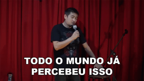 Comedian Andre Santi on stage, delivering a joke with the phrase 'Everyone has already noticed this'.