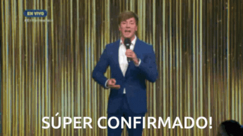 Roger Gonzalez on stage for Todos Quieren Fama, announcing 'Súper Confirmado!' in a blue suit.