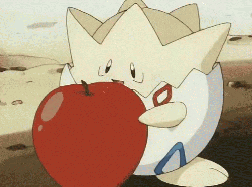 Togepi, the adorable Pokémon, happily holds and eats a large, shiny red apple.