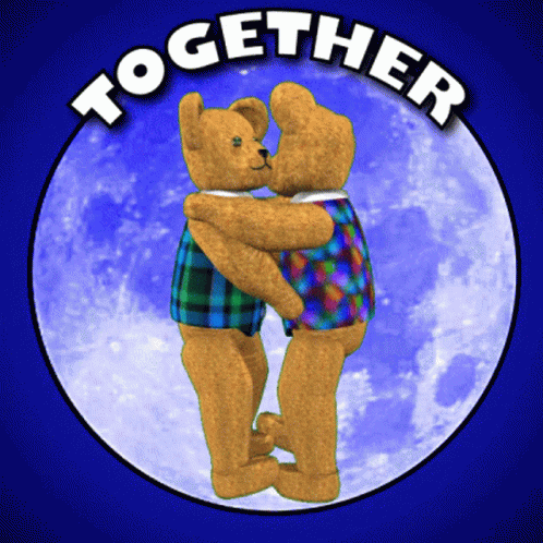 Two adorable teddy bears embrace in a warm hug, set against a glowing blue moon with the word 'Together'.