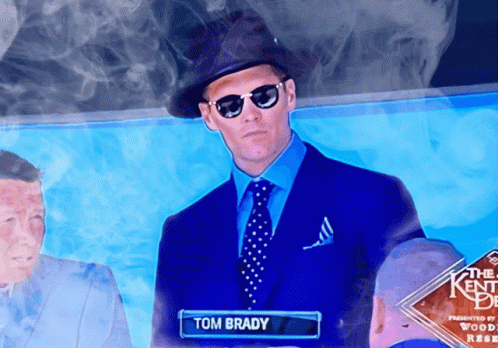Tom Brady, the legendary quarterback, looking dapper in a blue suit and hat at the Kentucky Derby with a smokey effect.
