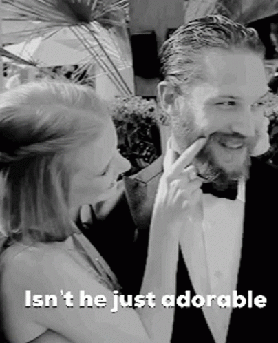 Tom Hardy being adored by a woman, with a caption 'Isn't he just adorable'.