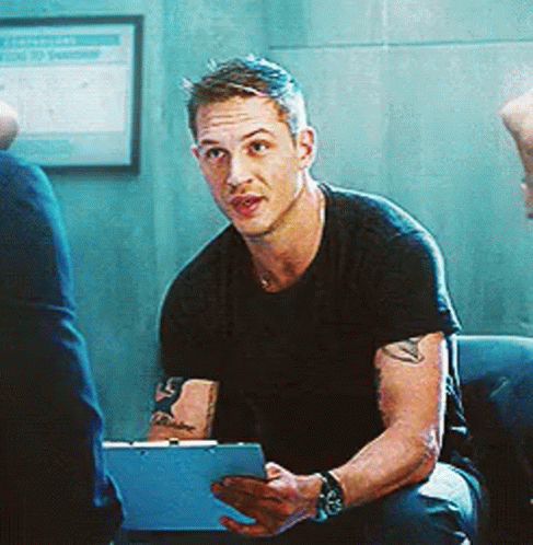 Tom Hardy sits, holding a blue clipboard, looking engaged in a conversation.