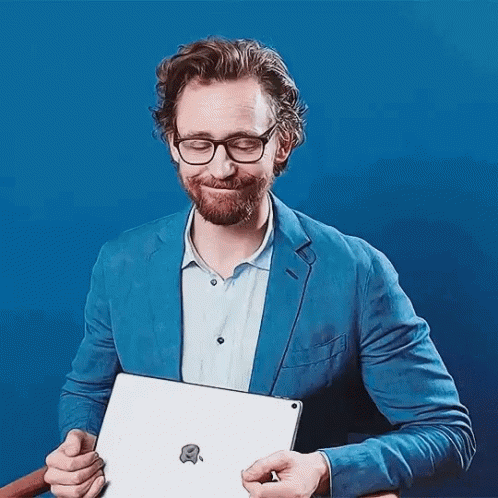 Tom Hiddleston as Loki, wearing glasses and a blue suit, smirking while holding a laptop.
