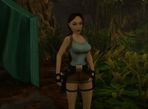 Lara Croft from Tomb Raider III stands in a jungle setting, looking annoyed and impatient.