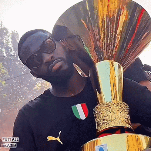 Fikayo Tomori, wearing sunglasses, proudly holds the Serie A Scudetto trophy after AC Milan's victory.