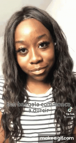 A woman in a striped shirt looks at the camera with the French text 'ton bangala commence à durcir' overlaid.