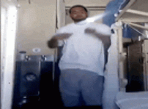 A man performs the Tonga Lek dance, pulling his white shirt up and down in a small room.