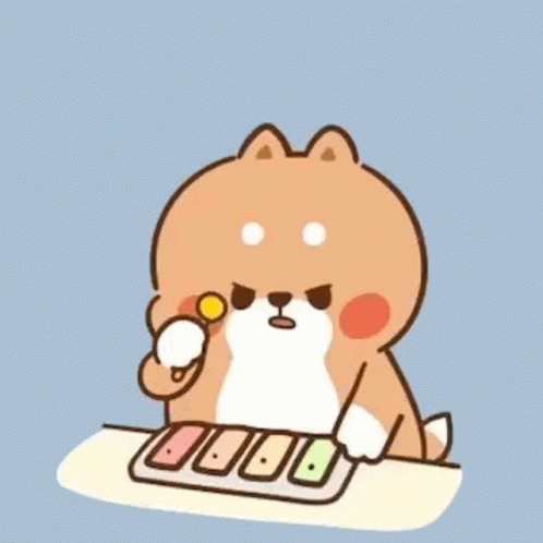 Yuta from Tonton Friends, an angry Shiba Inu, plays a xylophone with 'Ding! Ding!' captions above.