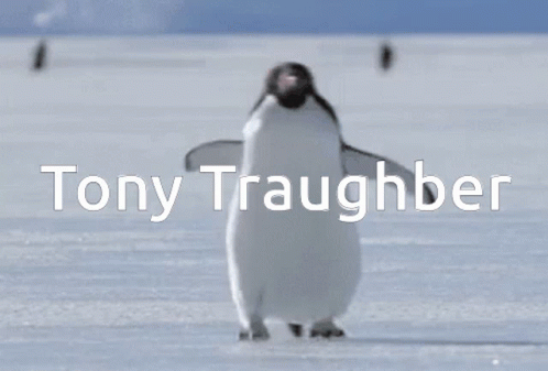 A penguin walks across an icy landscape, with the name Tony Traughber displayed as a text overlay.
