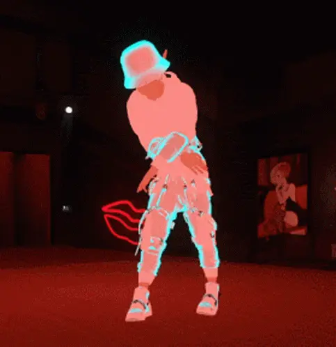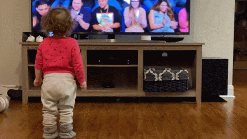 A happy baby girl dances enthusiastically in front of a television, smiling and moving to the music.