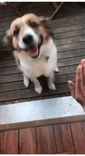 Tootie Doge, a cute dog, happily gives a high five to a person on a wooden deck.