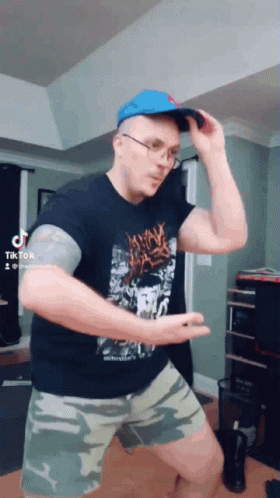 Anthony Fantano, known as TheNeedleDrop, dances energetically while wearing a blue hat and camo shorts.
