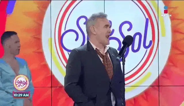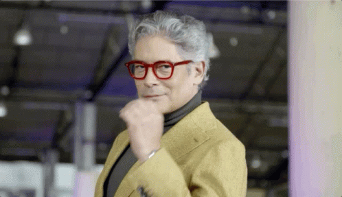 Boris Izaguirre, wearing red glasses and a yellow jacket, adjusts his glasses and looks at the camera.
