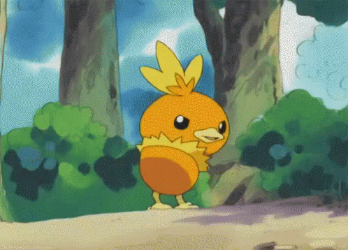 Torchic, the fire-type Pokémon, stands in a lush forest, looking around with curiosity.