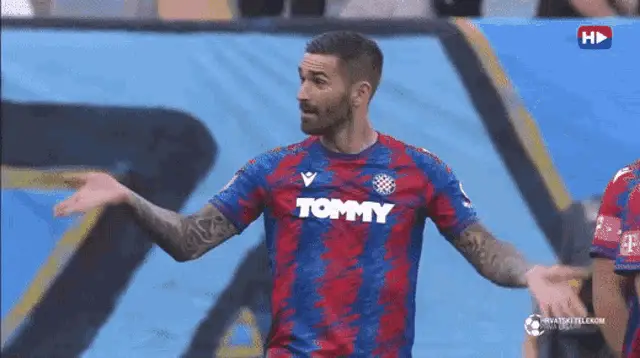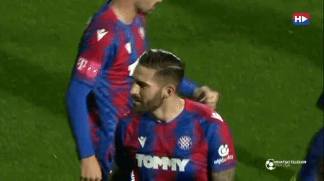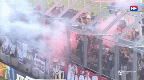 Football fans, Torcida Split and Torcida Rijeka, ignite flares and smoke in the stadium stands.