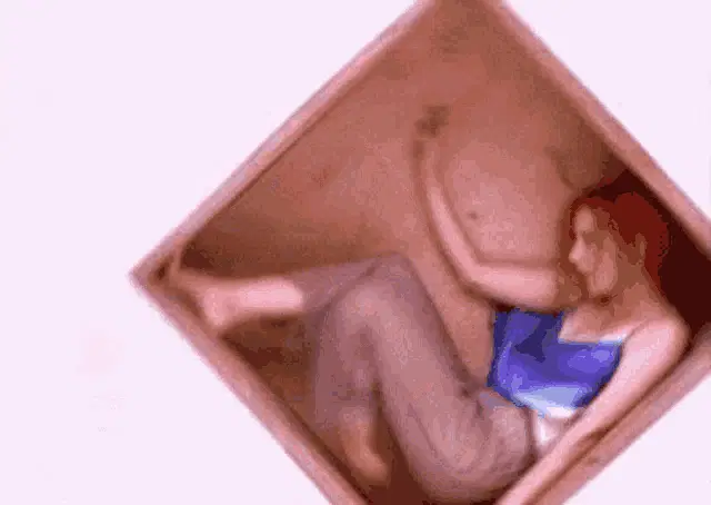 Tori Amos dancing energetically in an orange top and blue skirt, set against a bright white background.
