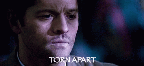 A close-up of Castiel from Supernatural with the text 'TORN APART' overlaid, showing his pensive expression.