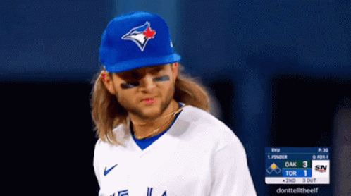 Toronto Blue Jays star Bo Bichette shrugs on the field during a game, showing a moment of 'Oh Well'.
