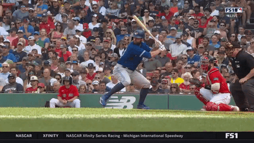 Brandon Belt of the Toronto Blue Jays takes a powerful swing during a baseball game, with a catcher and umpire nearby.
