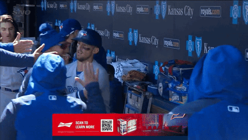 Cavan Biggio of the Toronto Blue Jays celebrates with teammates in the dugout during a baseball game.