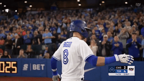 Cavan Biggio of the Toronto Blue Jays celebrates a home run with his teammates in front of cheering fans.