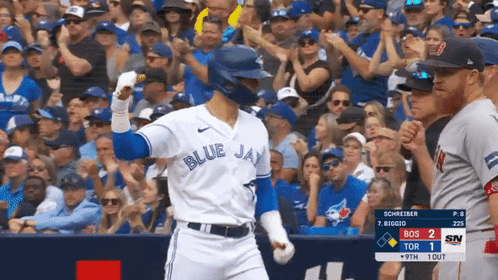Toronto Blue Jays player Cavan Biggio celebrates on the field, pumping his fist after a play. The scoreboard shows TOR 9, BOS 2.