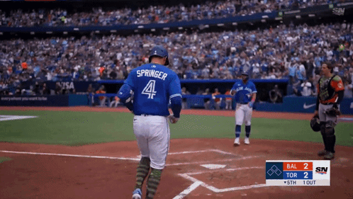 George Springer of the Toronto Blue Jays celebrates a play on the field during a baseball game.