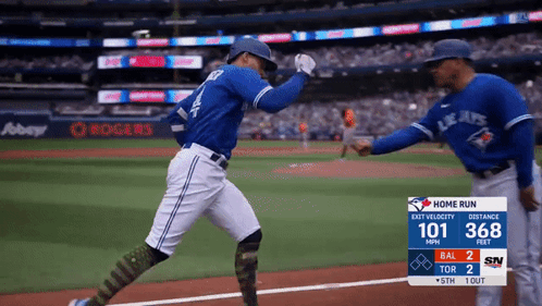 George Springer celebrates a home run for the Toronto Blue Jays, with game stats displayed.